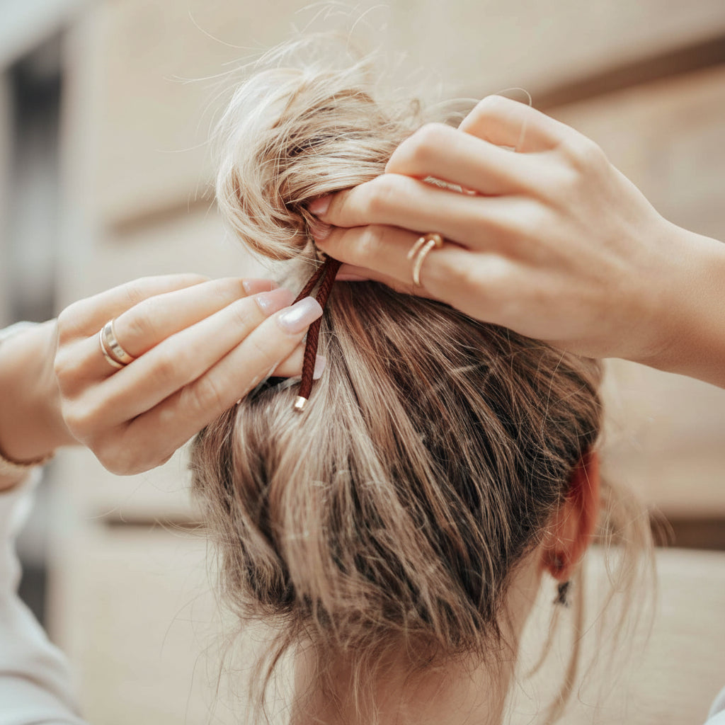 Für sehr schweres Haar: Wickle das Maivy Band zweimal wie ein Zopfgummi um Dein Haar & zieh es anschließend wie gewohnt fest.